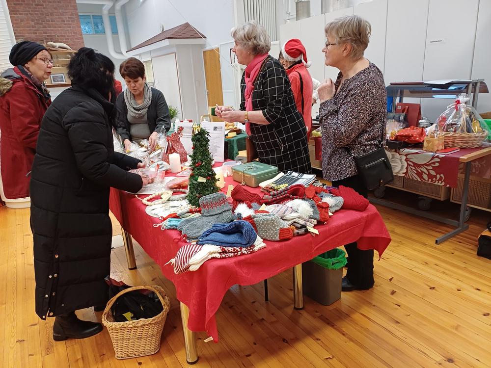 Meillä oli hyvä päivä❣️Kiitokset kaikille vapaaehtoistyön tekijöille ja myyntituotteiden lahjoittajille. Pienarpajaisissa riitti jännitystä viimeiselle tunnille asti, kunnes Marko Lipsonen voitti himoitun ison tuotekorin. Kahvion pöydissä oli mukavaa juttuseuraa. Kahvi/tee, pulla ja pikkuleipä maksoi vain 2 euroa. Myös leivonnaiset myytiin loppuun. Villasukkia oli melkein kaikilla pöydillä, joten niiden myynti jäi vähäiseksi.