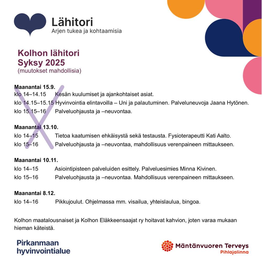 Tervetuloa kaikille avoimeen Kolhon muistikahvilaan! Ohjelmamuutokset mahdollisia. MUISTIKAHVILA Aika: pe 14.11. klo 13:00 - 14:30 Paikka: Mäntyrinteen palvelutalo, Uimalantie 6, Kolho Ohjelmassa:…