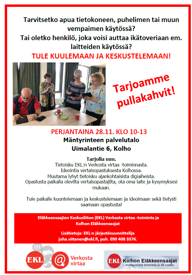 Aika: perjantai 28.11. KLO 10-13 Paikka: Mäntyrinteen palvelutalo, Uimalantie 6, Kolho Tarjolla mm. : - Tietoisku EKL:n Verkosta virtaa -toiminnasta. - Ideointia vertaisopastuksesta Kolhossa. -…